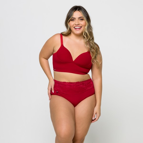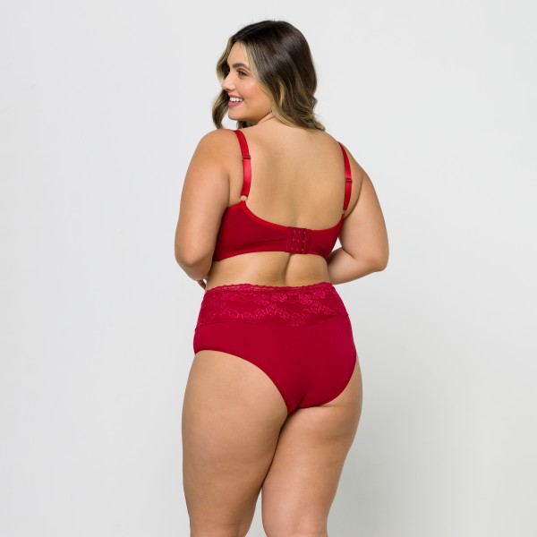 Calcinha de Cintura Alta Plus Size em Algodão Egípcio na cor Rubi com Barra de Renda Forrada